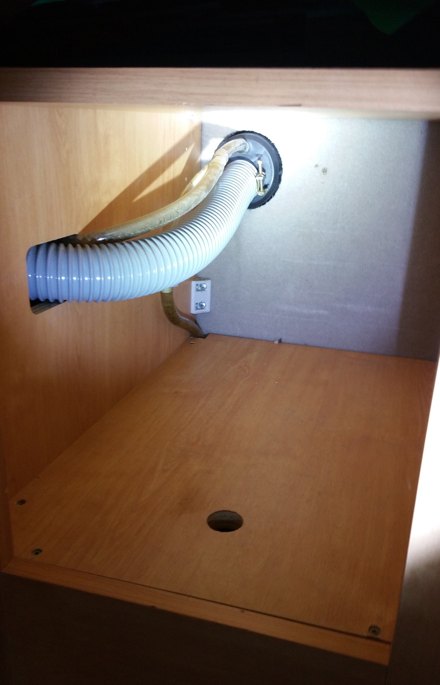 Im Schrank sieht man den angeschlossenen Schlauch zum Einfüllen und den Schlauch zum Entlüften.
