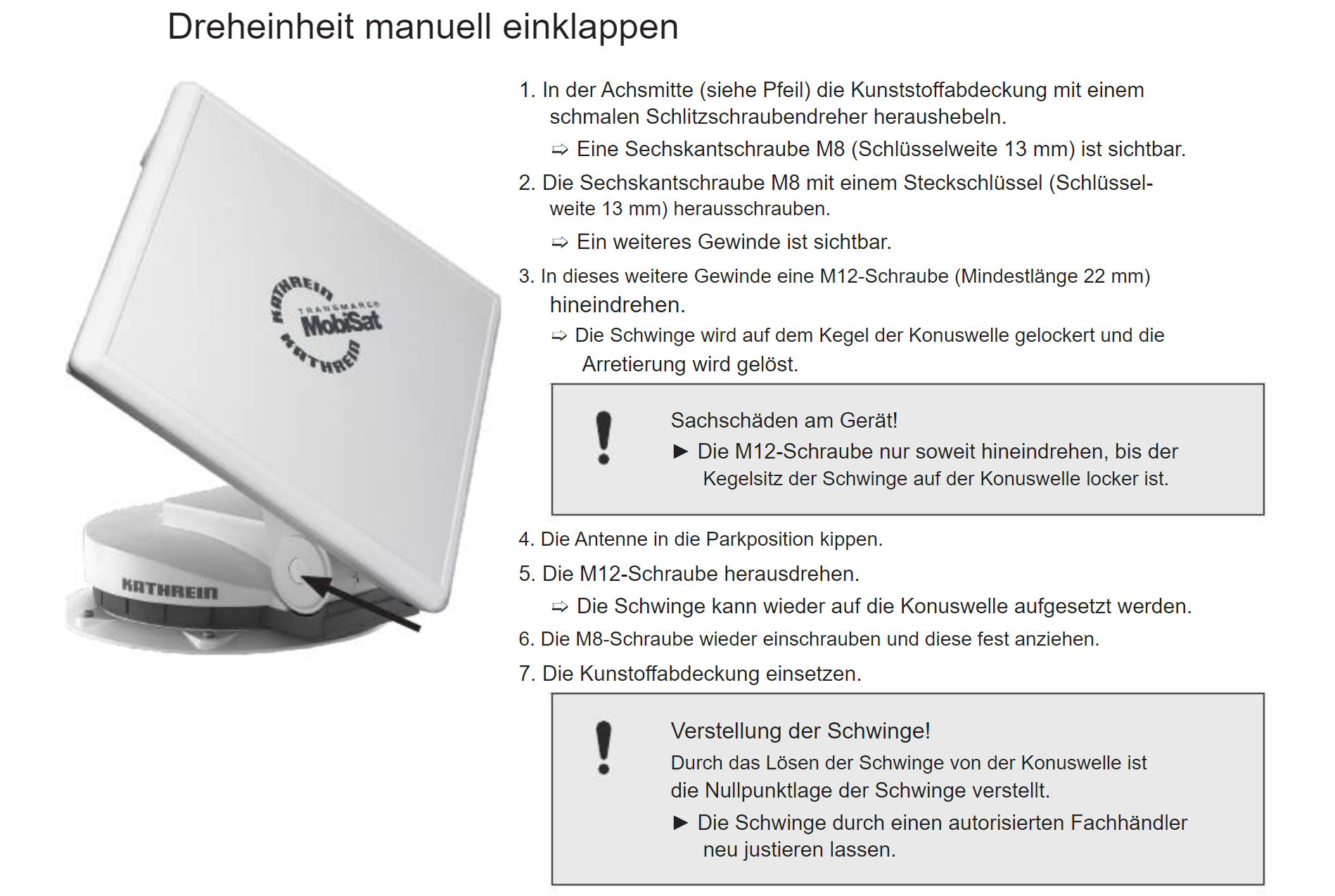 Eine Kathrein Cap Drehantenne manuell in Parkposition bringen oder vorbereiten zum Öffnen der Dreheinheit.