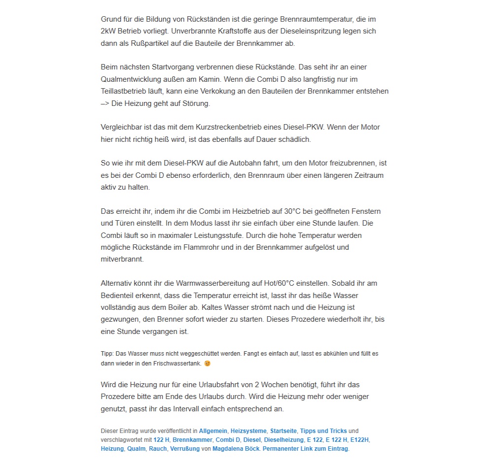 Truma empfiehlt die Combi Diesel Heizungen hin und wieder einige Zeit unter Volllast zu betreiben.
