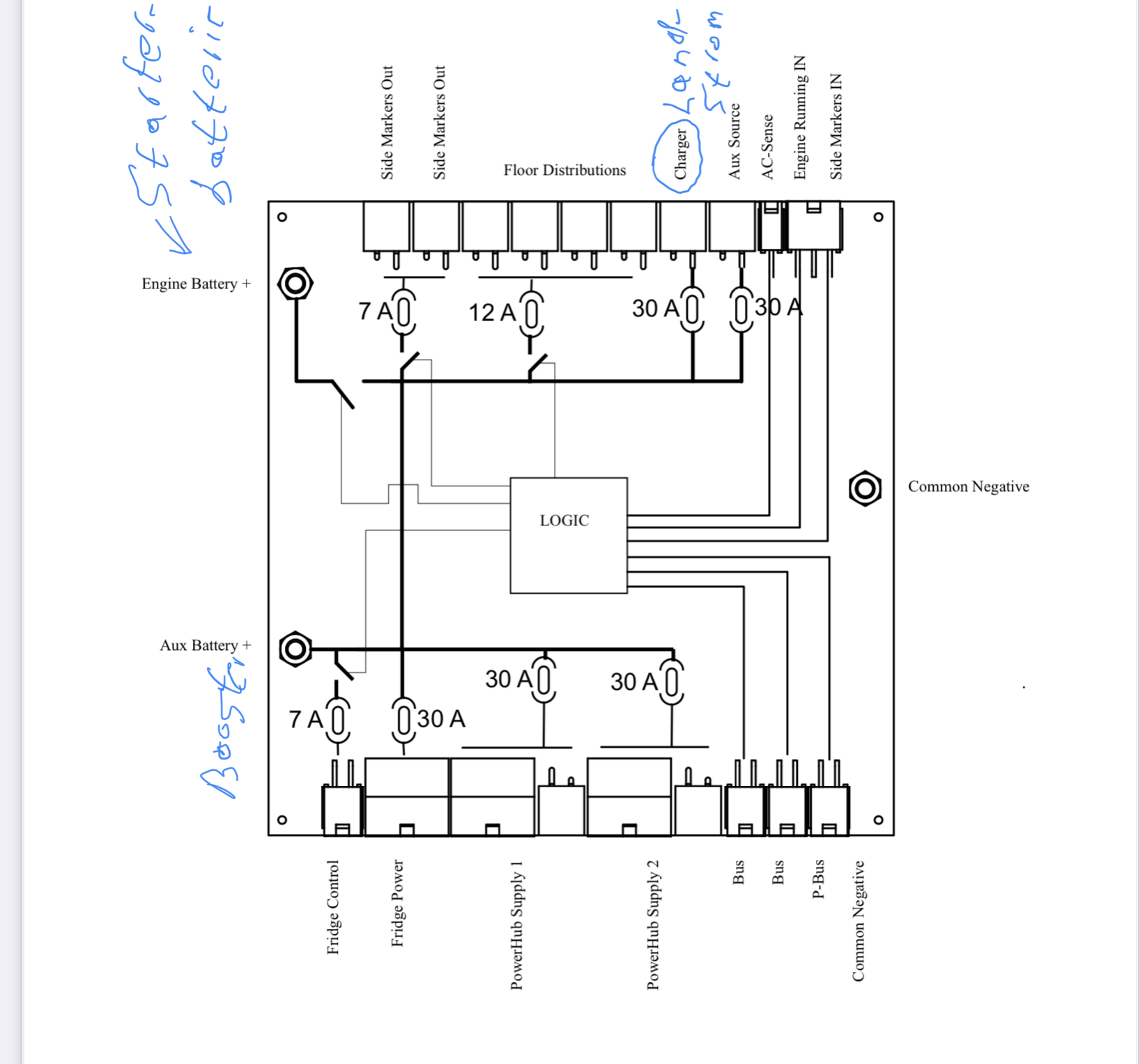 Soweit ok, die 30Amp. Sicherung zwischen Ladegerät und dem Power Verteiler brauchst du aber nicht, diese in im Power Verteiler drin ( F1 30A Schutz der Eingangsleitung BATTERIE-LADEGERÄT CT8) , siehe Anleitung.